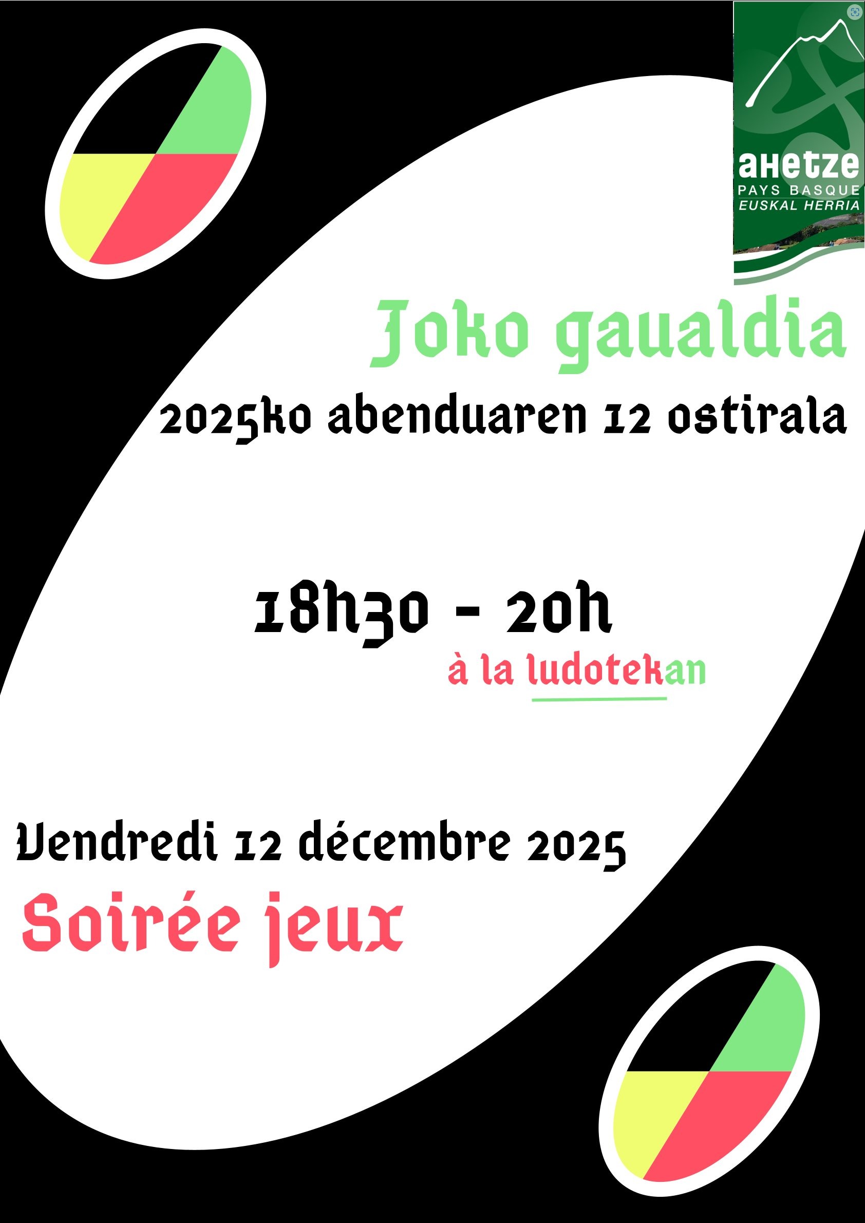 Abenduaren 12 ortziralarekin JOKO GAUALDIA Ahetzeko KULTUR XOKOko LUDOTEKAN arr.6ak eta erdietatik 8etara. Hurbil zaitezte !