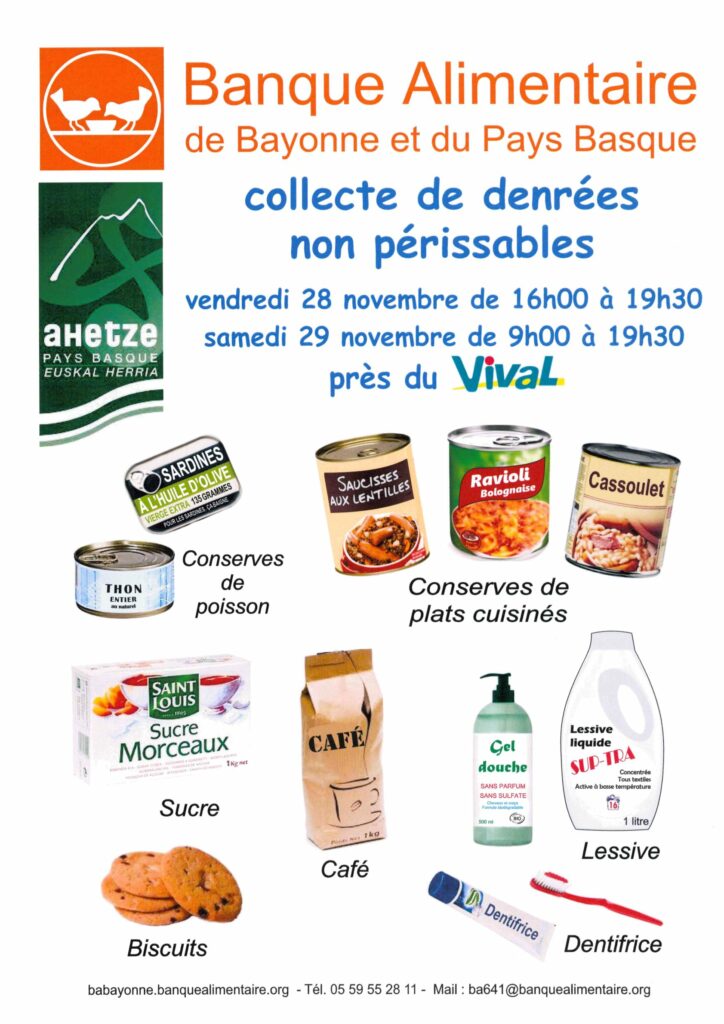 Collecte de denrées non périssables au profit de la BANQUE ALIMENTAIRE de Bayonne et du pays basque (https://babayonne.banquealimentaire.org/associations-et…) !