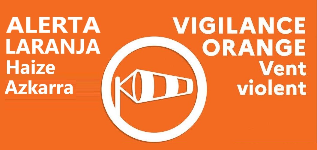 ALERTA LARANJA HAIZE AZKARRA Publié le : 08 urtarrila 2026 Kasu egizue aintzinikusia den haize azkarrarengatik alerta laranjan girelako gau huntatik bihar arte. #Goretti#tenpesta#tempête Partager