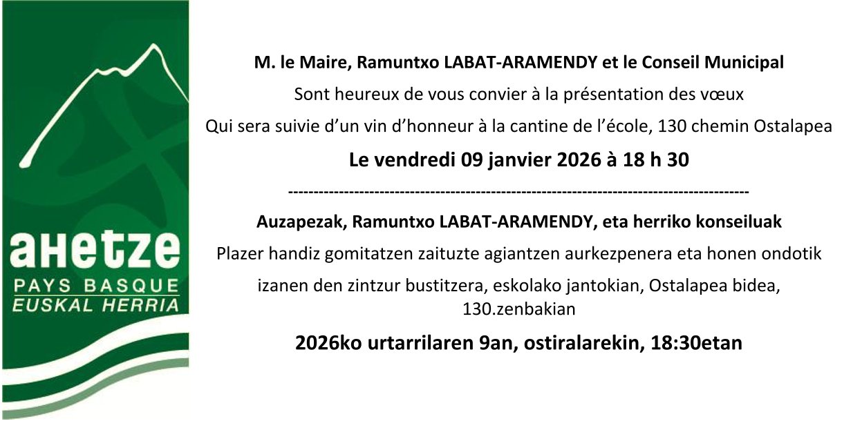 (FR) Cher.e.s aheztar M. le maire ainsi que le conseil municipal vous donne rendez-vous ce vendredi à partir de 18h30 à la cantine de l’école pour les vœux 2026.