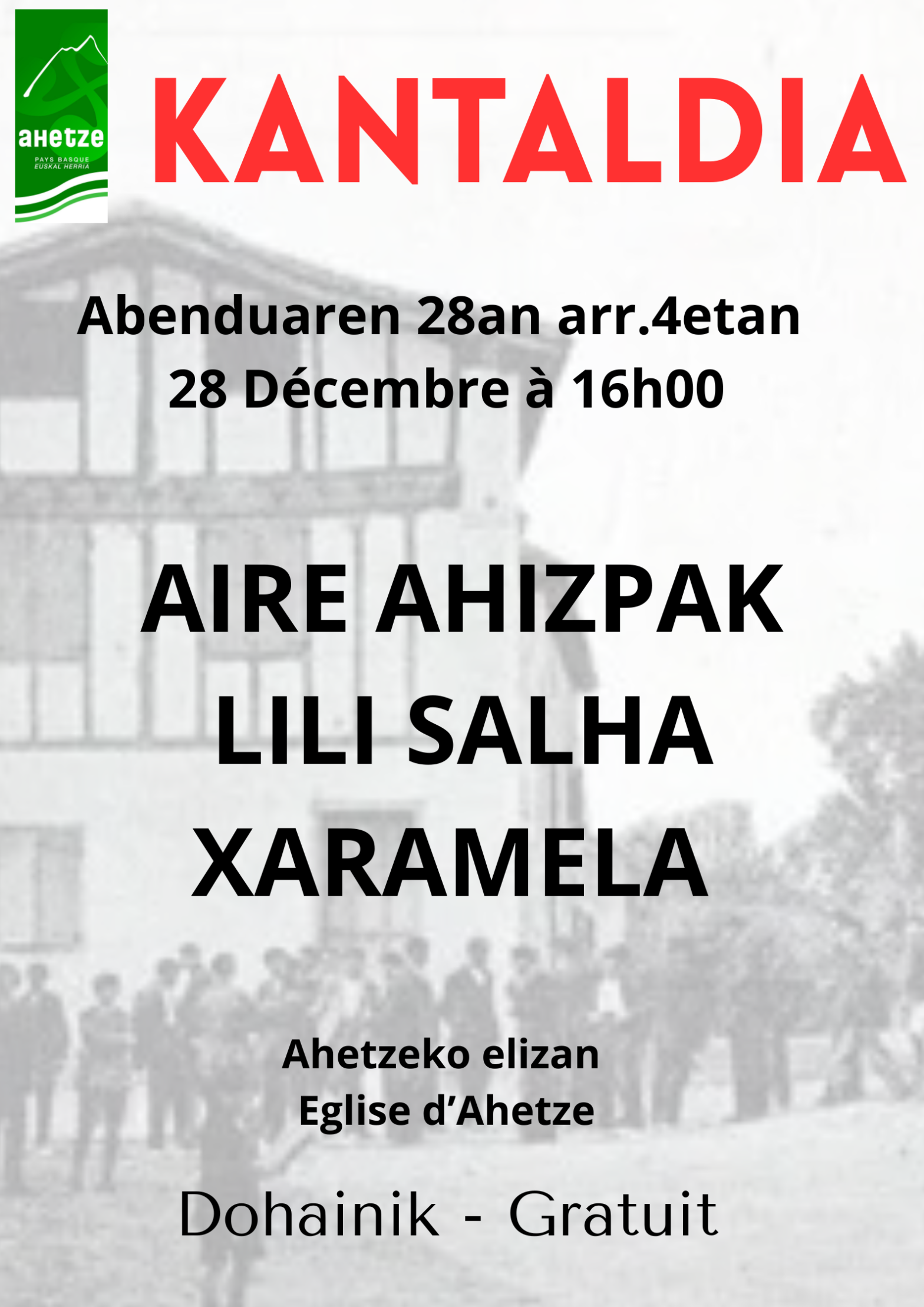 (EUS) Urte ondarreko KANATALDIA, Ahetzeko herriko etxeak antolaturik, abenduaren 28an igandearekin arr. 4etatik goiti elizan.