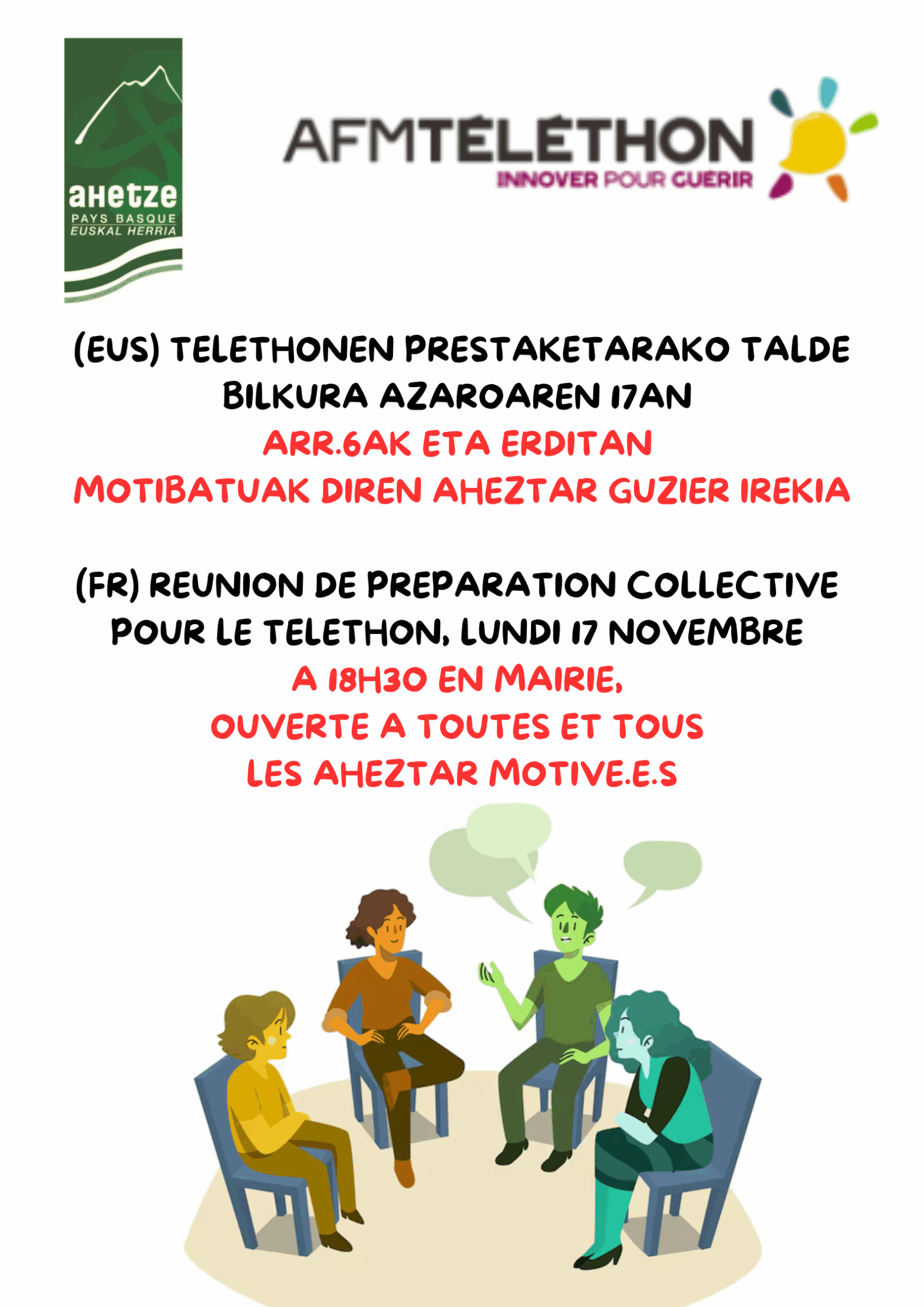 Réunion de préparation collective, pour le Téléthon lundi 17 novembre à 18h30 en mairie, ouverte à toutes et tous les aheztar motivé.e.s.